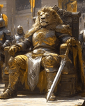Image Description: The image depicts a majestic lion sitting on a royal throne, wearing an exquisite golden armor that exudes power and grandeur. The ...[+]