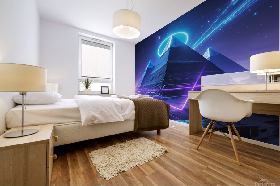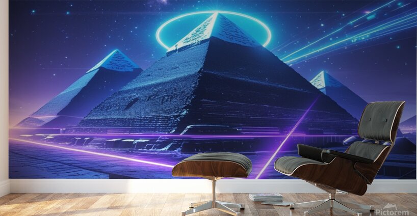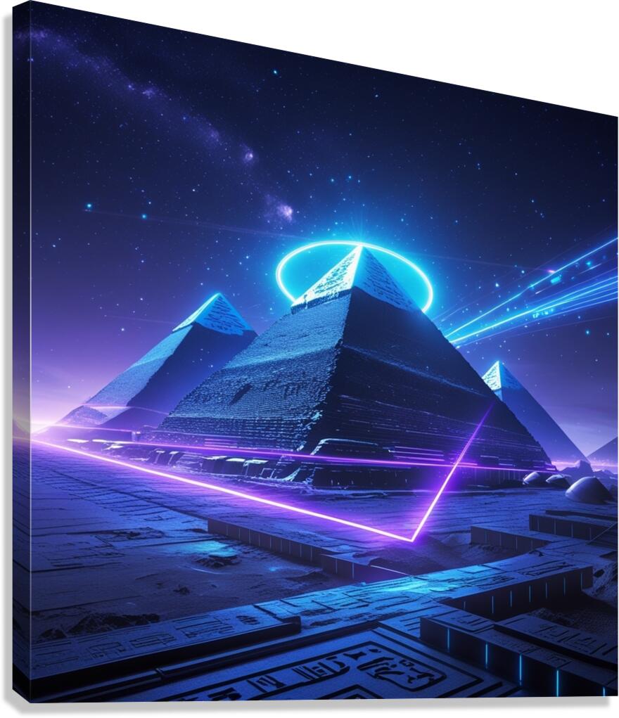 He drew Egyptian pyramids in a cyberpunk style, illuminated with blue and purple neon effects, with a starry night sky and a futuristic light halo sur...[+]