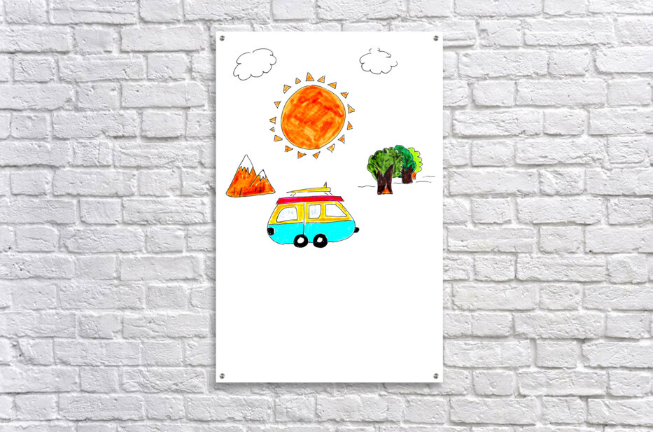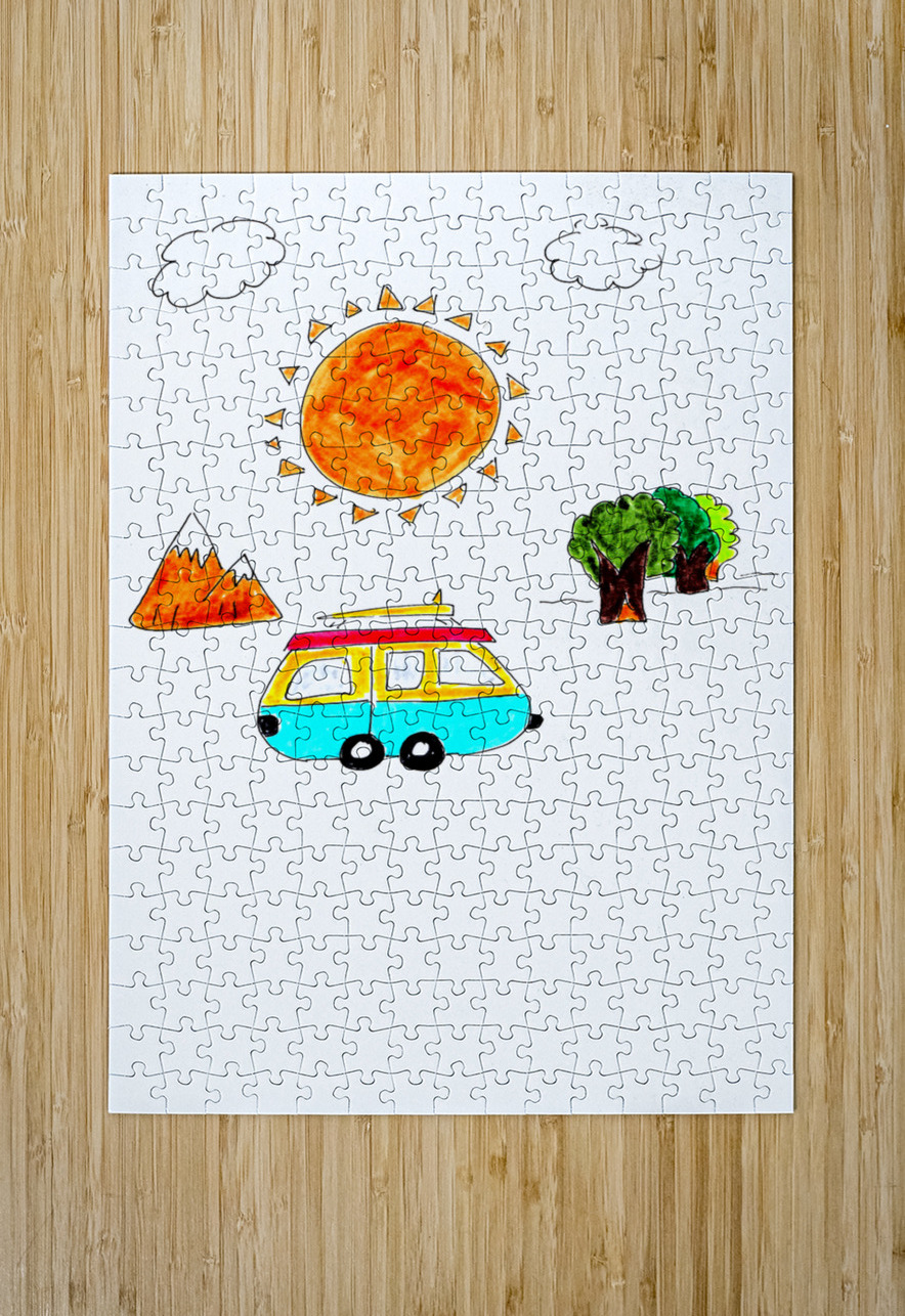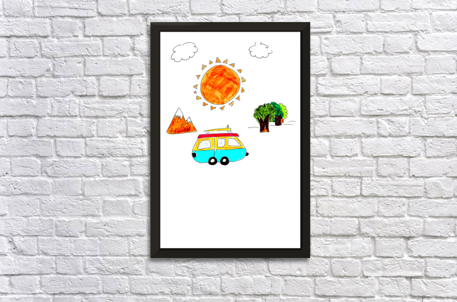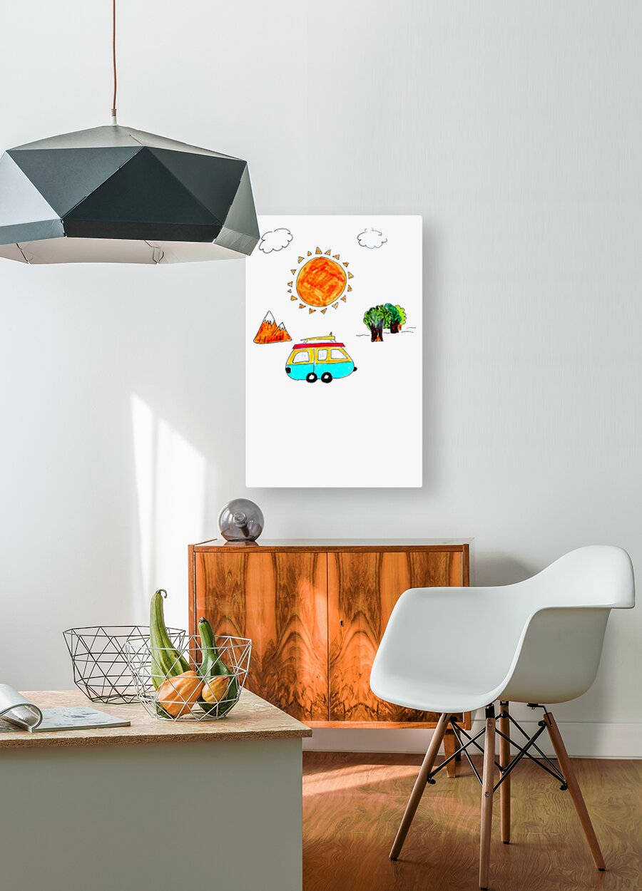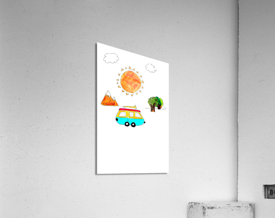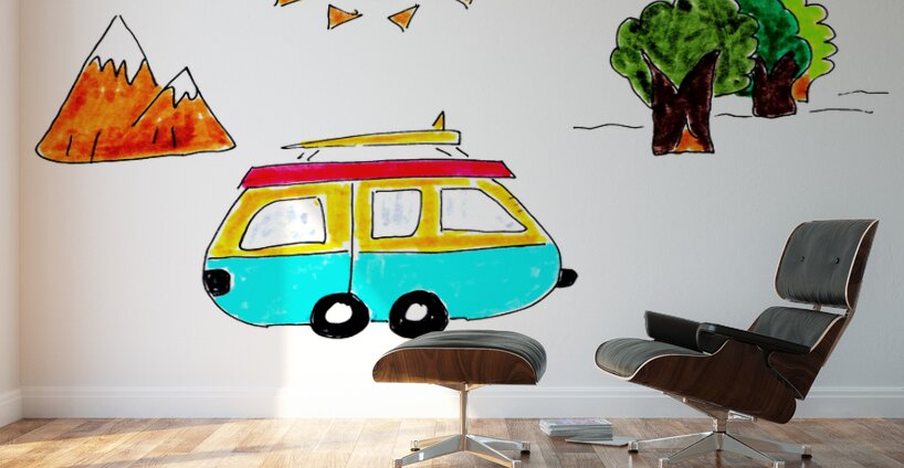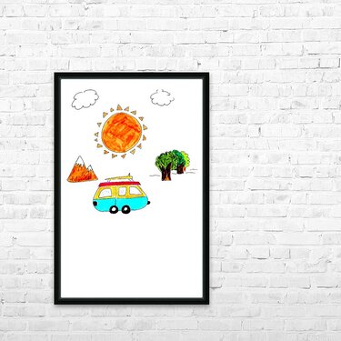 Originally a hand drawn design created using coloured ink pens and paper, laterally digitally manipulated ( including some colour enhancement and the use of AI Magic Background Remover in canva.com) enabled this cute piece of doodle art to emerge. Features a colorful drawing showcasing a bright sun above a small van traveling between a mountain and trees. The whimsical scene is set against a plain background with a playful and simple style.