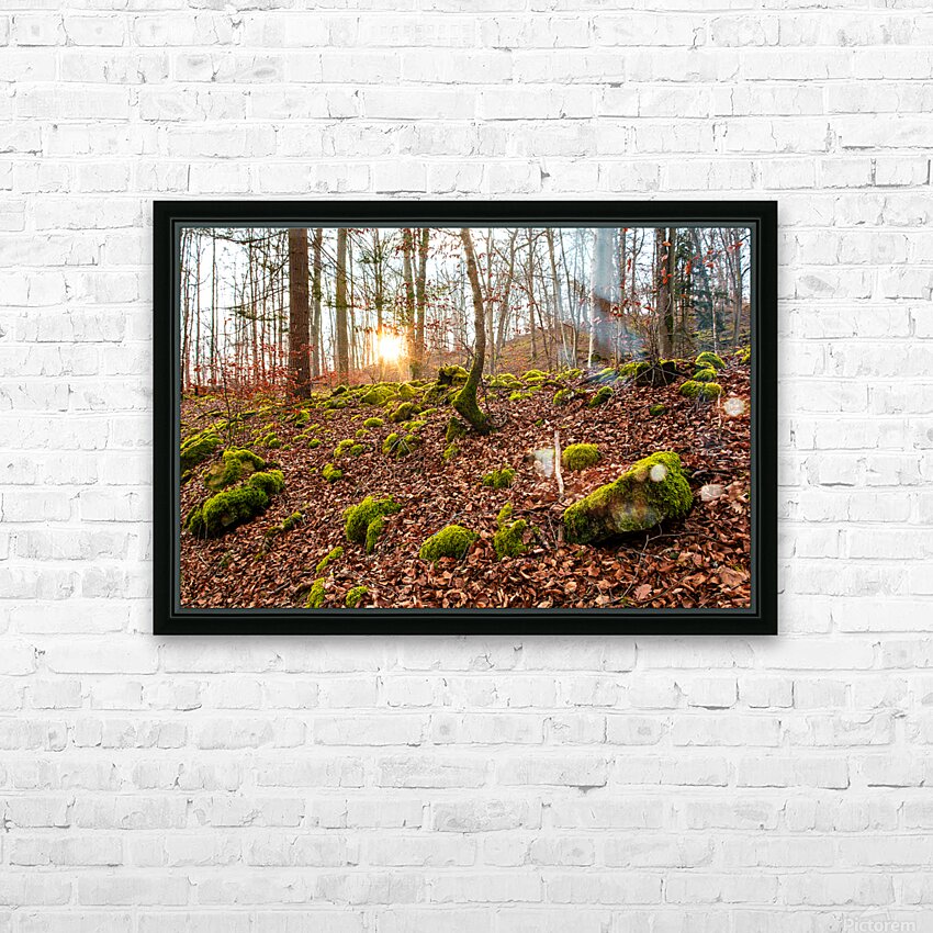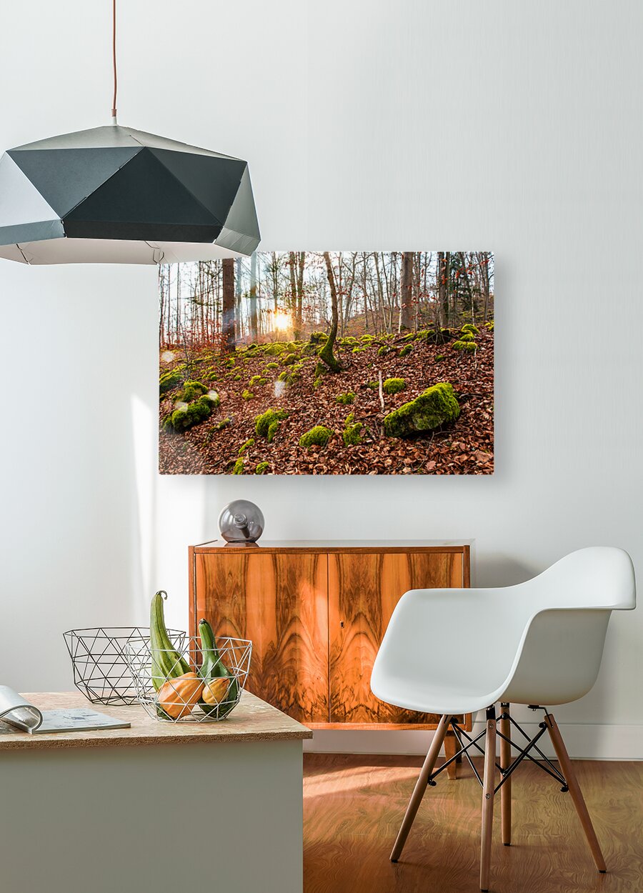 Get this artwork "Evening sun reflecting on beautiful moss covered rocks in the forest " in a framed print.
