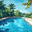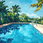 Tropical pool scene with lush foliage and vibrant blue water under a clear sky. Technique: Acrylic on canvas, influenced by David Hockney and Henri Matisse Artist's Intent: To evoke a sense of calm and relaxation through a vibrant depiction of a tropical oasis. Contribution: Appeals to collectors interested in contemporary landscapes and leisure themes. Influences: Impasto strokes create texture and movement, capturing light and shadow interplay.