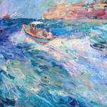 A fishing boat navigates a vibrant, active sea near a hazy coastline. Technique: Oil on canvas, influenced by J.M.W. Turner and Claude Monet. Artist's Intent: To evoke the dynamism and beauty of the sea through expressive brushwork and color. Contribution: Appeals to collectors of Impressionistic and contemporary seascapes. Influences: Impasto strokes capture the movement of water and light. Vivid colors blend seamlessly.