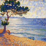 Pointillist coastal landscape with vibrant colors and shimmering light effects. Technique: Oil on canvas, influenced by Paul Signac and Vincent van G...[+]