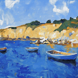 Tranquil seascape with three small boats, a rocky shore, and cliffs under a blue sky. Technique: Oil on canvas, influenced by Claude Monet and Vincent van Gogh Artist's Intent: To evoke a sense of peace and tranquility through the depiction of a serene coastal scene. Contribution: Appeals to collectors of Impressionistic and Post-Impressionistic styles, particularly those drawn to seascapes and landscapes. Offers a serene and timeless quality. Influences: Impasto technique with visible brushstrokes creates texture and depth. Colors are applied thickly, giving a sense of movement and energy to the water and sky.