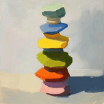 A stack of colorful, irregular shapes creates a playful yet thought-provoking composition. Technique: Oil on canvas, influenced by Richard Diebenkorn and Wayne Thiebaud Artist's Intent: To evoke a sense of playful balance and explore the interaction of simple forms. Contribution: Appeals to collectors interested in contemporary still life and abstract art. The bright, cheerful palette has broad commercial appeal. Influences: Thick impasto strokes create a textured, sculptural feel. Colors are applied in flat, distinct areas, emphasizing the forms.