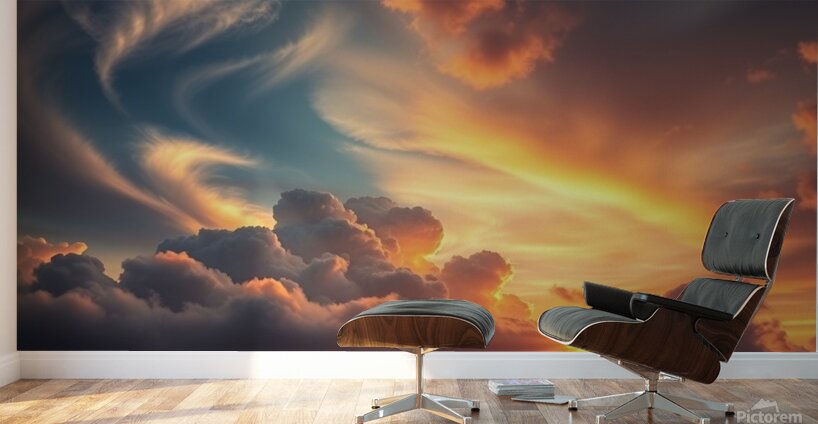 A stunning skyscape at sunset, where dense, scattered clouds intertwine with the golden rays of the sun, creating stunning hues between deep blue and ...[+]