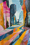 A lone figure stands within a vibrant, geometric landscape of intersecting planes and bold colors. Technique: Acrylic on canvas, influenced by Frank ...[+]