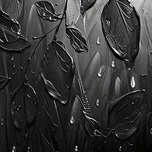 Black impasto leaves and raindrops on a textured background. Technique: Oil on canvas, influenced by Pierre Soulages and Ad Reinhardt Artist's Intent: To evoke a sense of quiet contemplation and the beauty of simple forms. Contribution: Appeals to collectors interested in minimalist, monochrome, and textured art. Strong potential for upscale interior design markets. Influences: Impasto technique creates textured leaves and rain droplets on a layered black background.