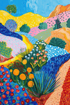 A vibrant, stylized landscape featuring rolling hills, blooming flowers, and a clear sky. Technique: Acrylic on canvas, influenced by Henri Matisse and David Hockney Artist's Intent: To evoke a sense of joy and wonder through a vibrant celebration of nature's beauty. Contribution: Appeals to a broad audience seeking vibrant and uplifting artwork. Suitable for both residential and commercial spaces, particularly those with a modern or eclectic aesthetic. Influences: Bold, flat colors and simplified forms create a vibrant, stylized landscape. Visible brushstrokes and textured areas add depth and tactile quality.