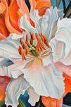 Close-up of a vibrant flower with coral and white petals, revealing intricate details of its anatomy. Technique: Oil on canvas, influenced by Georgia...[+]