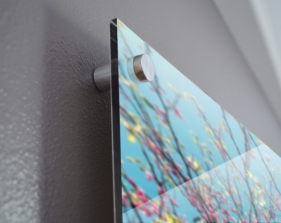 Printed to the edge - Ready to hang - provided with 4 premium polished aluminum stand off ( wall screws and mounting hardware provided )