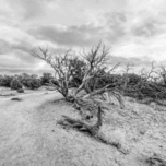A black and white photo with some cool dead looking juniper trees greeting you along the hiking path to Mesa Arch in Canyonlands National Park in Moab, Utah, United States. A partly cloudy sky overhead with a hint of a soft glow. Sparse vegetation adds some contrast to the dirt and sand desert landscape. This photo was taken by Jennifer White with Timeless Moments Photography. All images are copyrighted © Timeless Moments Photography/Jennifer White. All rights reserved. Please note the watermark does not print on ordered products.