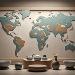 This breathtaking wall art piece embodies the perfect balance between nature and design. Featuring a textured world map in muted earth tones of teal and warm brown, it exudes a rustic yet sophisticated charm. Encased in a wooden frame, the artwork seamlessly blends with the serene arrangement of ceramic bowls, vases, and dried foliage, creating a cozy and harmonious atmosphere. The soft lighting casts subtle shadows, enhancing the depth and artistry of the piece. Ideal for minimalistic and nature-inspired interiors, this masterpiece serves as a timeless tribute to global beauty and elegant craftsmanship.