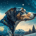 This striking illustration depicts a dog with a cosmic, dreamlike appearance. The dog's fur is rendered in a swirling, abstract pattern that evokes the night sky, with shimmering stars and celestial energy. The dog's gaze is intense and focused, as if it is attuned to the mysteries of the universe. The background features a mountainous landscape under a dramatic, swirling starry sky, adding to the otherworldly, enchanting atmosphere. The use of light and shadow, as well as the blurred, impressionistic style, creates a sense of mystery and wonder, inviting the viewer to lose themselves in the captivating scene. The overall effect is a visually stunning and imaginative interpretation of the natural world, blending the earthly and the cosmic in a truly unique and captivating way.