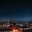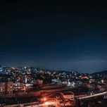 The image is a night view of a city from a high angle. The city is lit up with street lights and buildings, with a dark starry sky in the background.