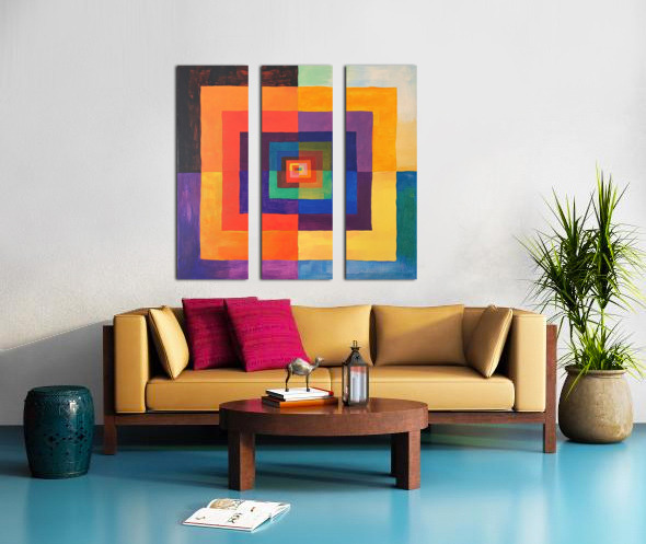 Concentric squares in vibrant hues create a mesmerizing visual effect. Technique: Acrylic on canvas, influenced by Josef Albers and Piet Mondrian. Artist's Intent: To evoke a sense of order and harmony through the precise arrangement of color and form. Contribution: Appeals to collectors of geometric abstraction and color field painting, suitable for modern and minimalist décor. Influences: Precise geometric forms create a concentric square pattern, exploring color interaction and spatial illusion.
