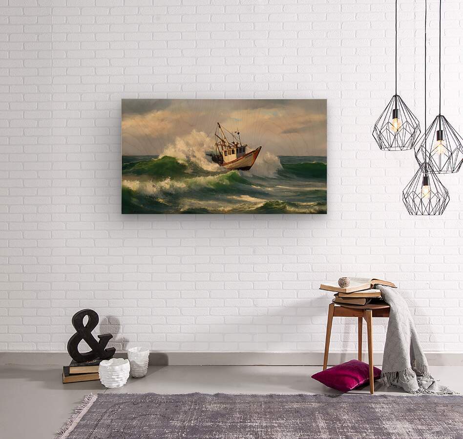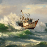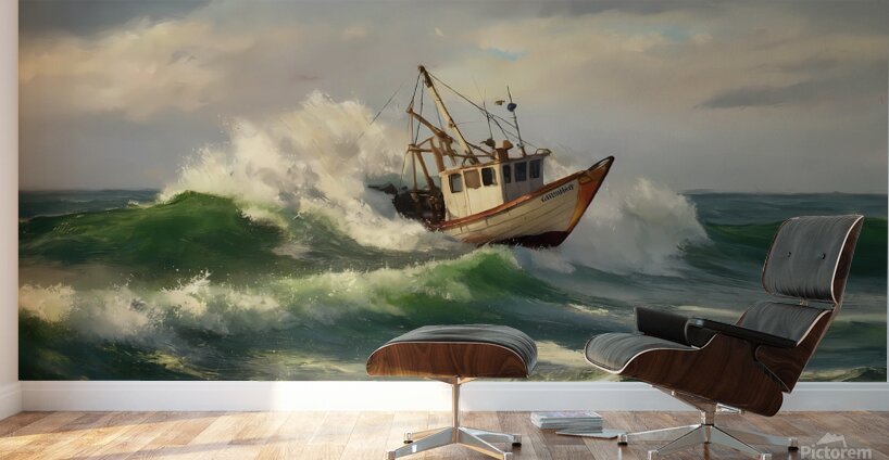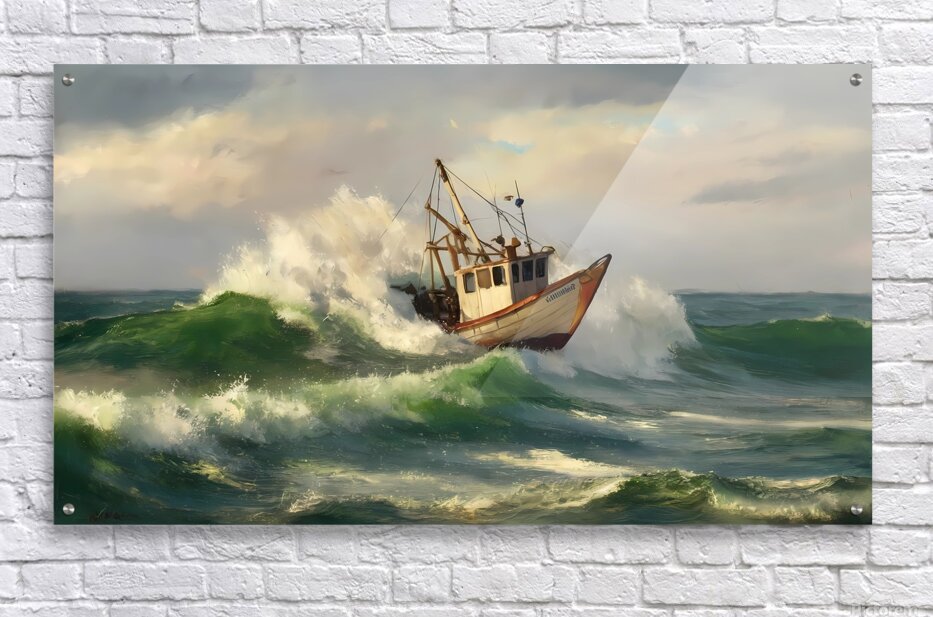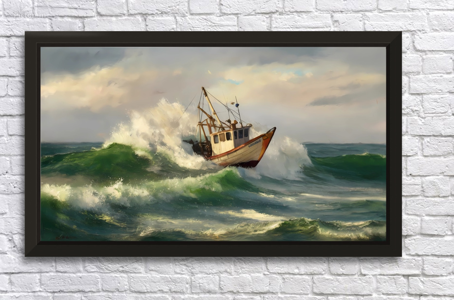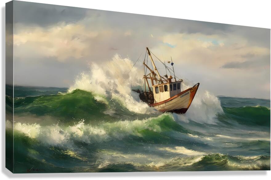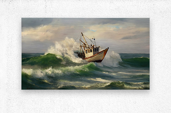 Dramatic painting of a fishing boat battling a powerful wave in turbulent waters.