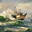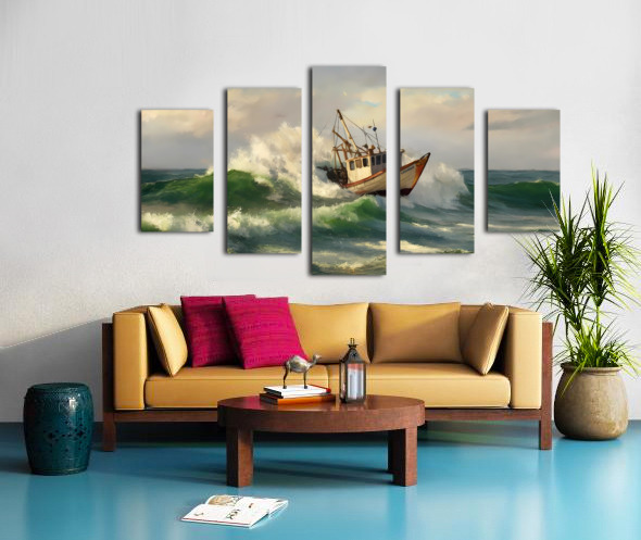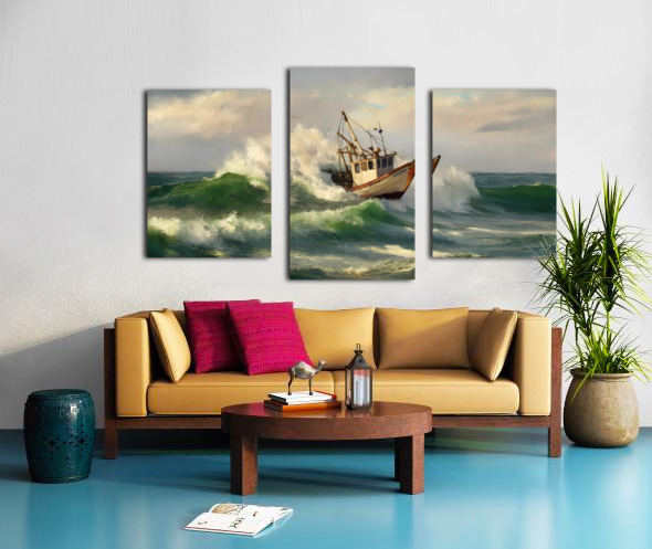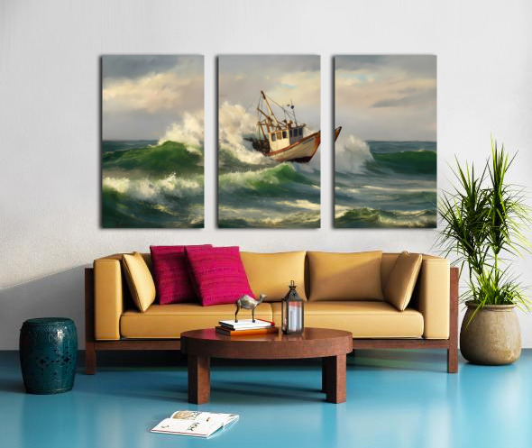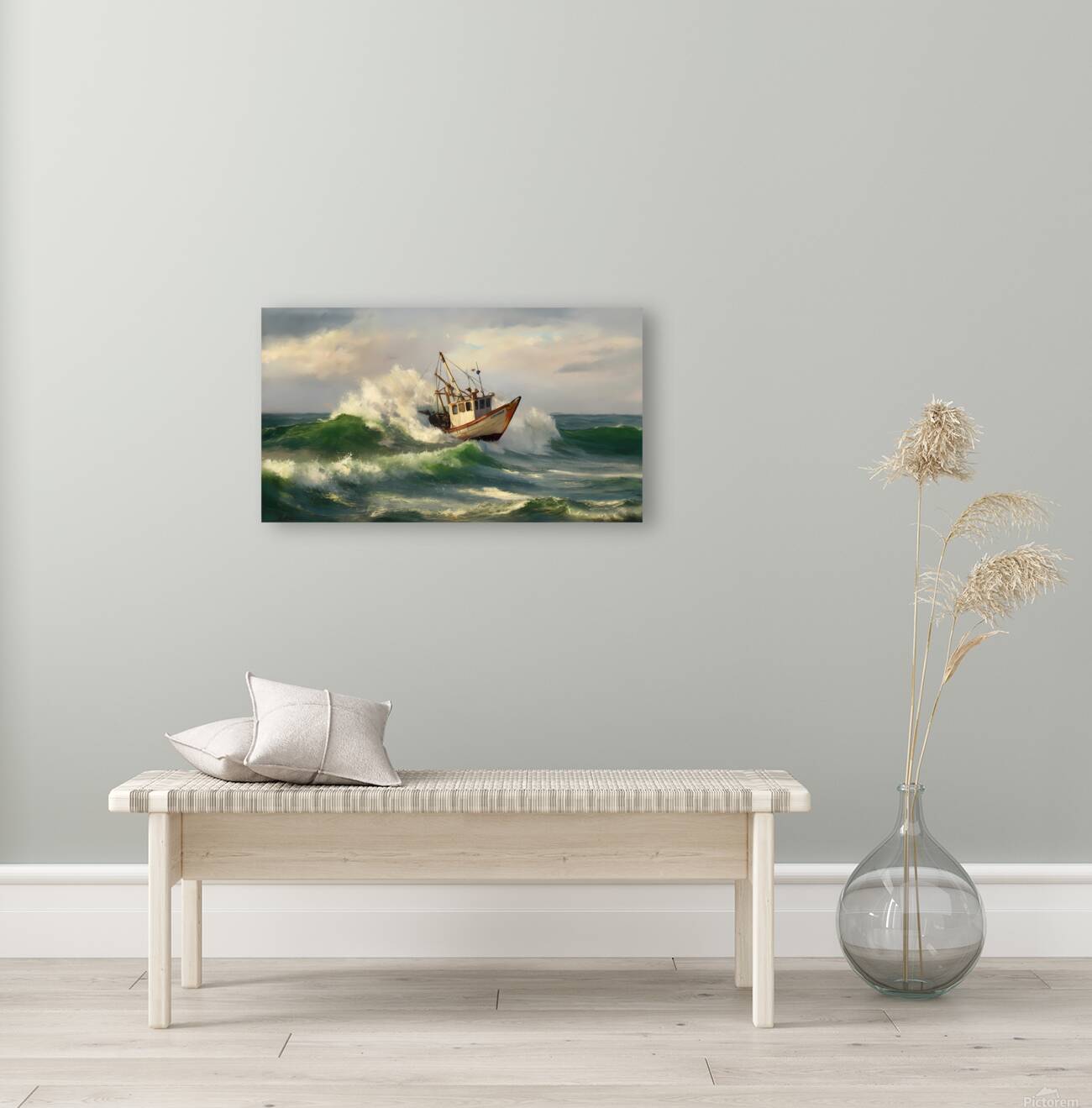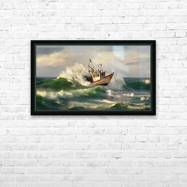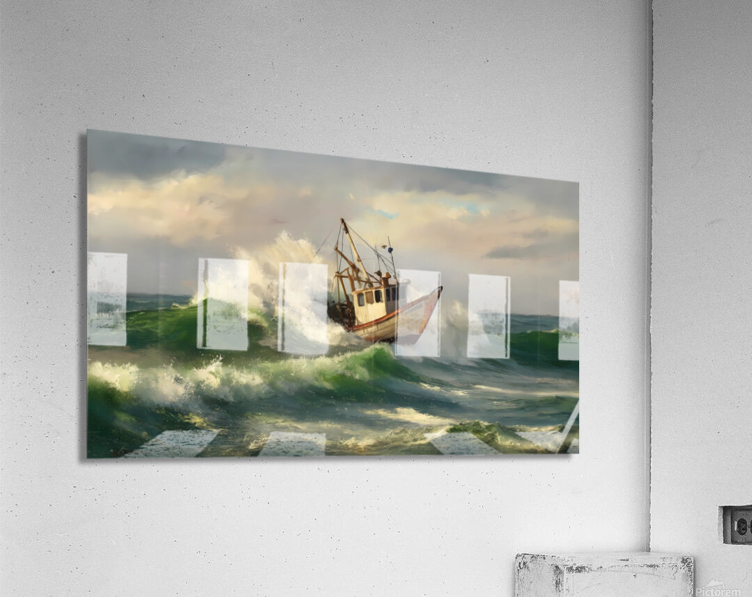 Dramatic painting of a fishing boat battling a powerful wave in turbulent waters.
