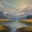 Beautiful landscape painting of a mountain lake with vibrant fall colors and dramatic sky.