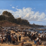 CHURCH–GOERS ARRIVING BY BOAT AT THE PARISH CHURCH OF LEKSAND ON SILJAN LAKE. SWEDEN [1853] BY WILHELM MARSTRAND [1810–1873]