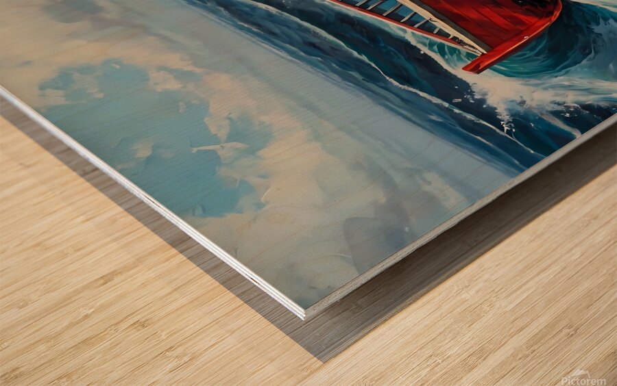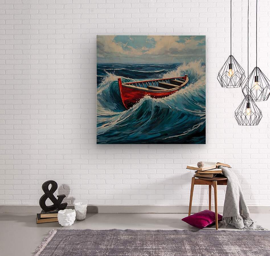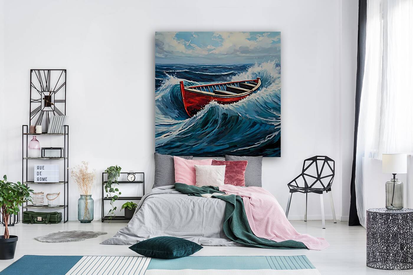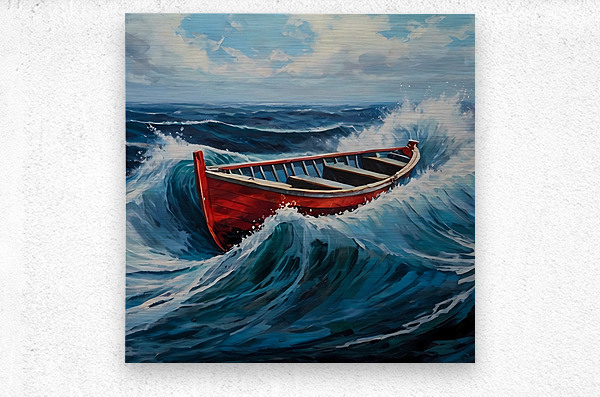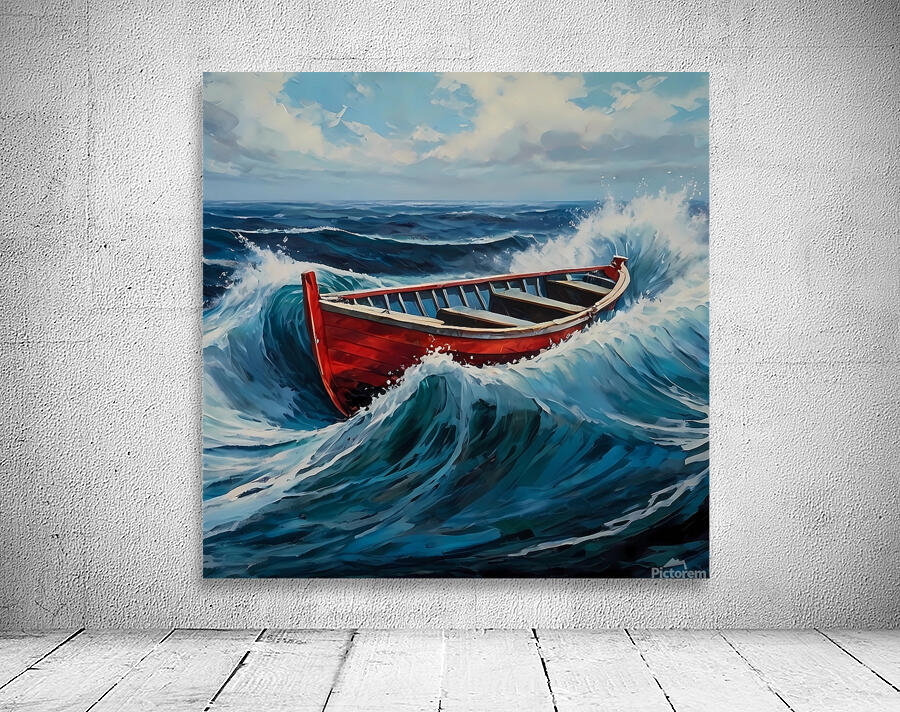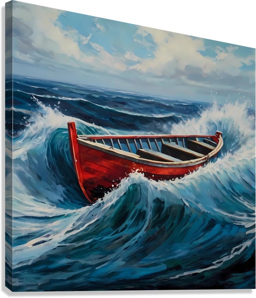 This striking image captures a vibrant red boat bravely navigating through a sea of tumultuous waves. The contrast between the vivid red of the boat and the deep blues and whites of the churning water creates a visually compelling scene. The dynamic composition and expressive brushstrokes evoke a sense of both power and vulnerability, making it a captivating piece for any space.
