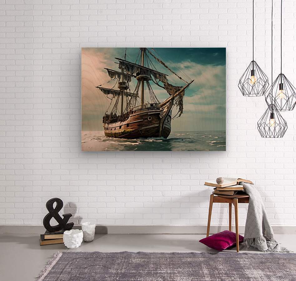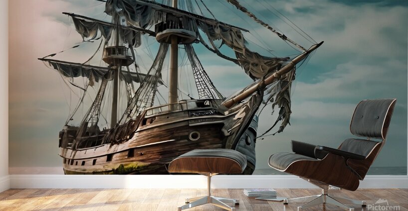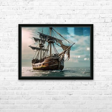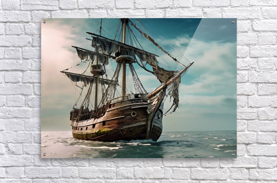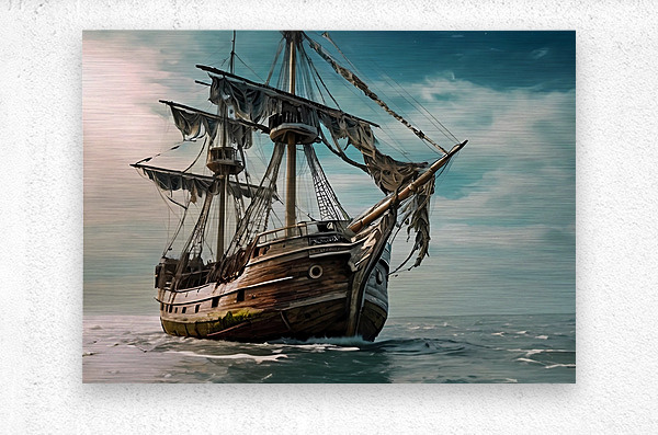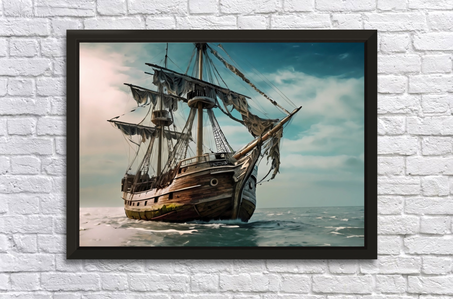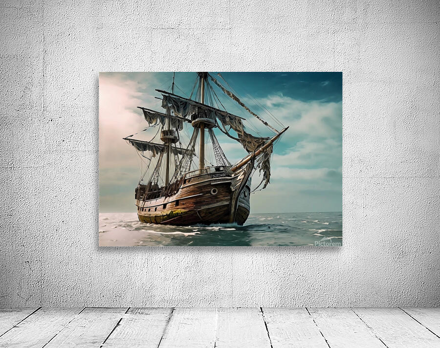 This evocative image features a weathered, three-masted galleon sailing on a calm sea under a pale dawn sky. The ship's sails are tattered and torn, hinting at a long and arduous journey, while the subtle lighting gives it an ethereal, almost ghostly appearance. The serene yet melancholic atmosphere of the scene makes it a captivating piece, suitable for adding a touch of history and mystery to any space.