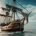 This evocative image features a weathered, three-masted galleon sailing on a calm sea under a pale dawn sky. The ship's sails are tattered and to...[+]