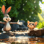 The rabbit teaches the kitten to swim in the water. The cute rabbit is a beautiful and completely expressive picture