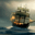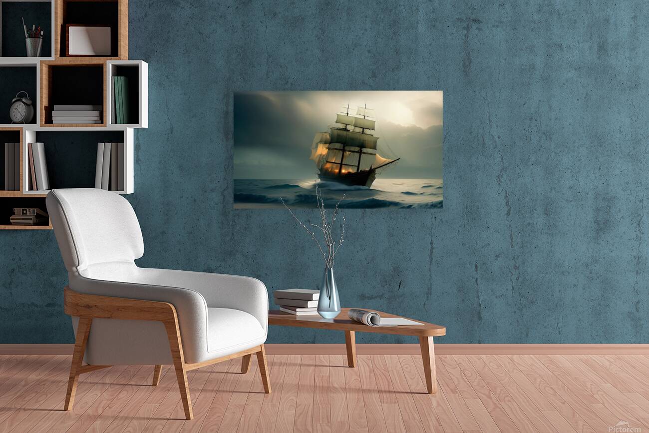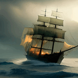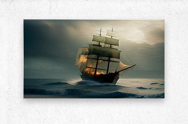 This dramatic image depicts a tall ship, its sails billowing, navigating through a churning sea under a brooding sky. The vessel is dramatically lit f...[+]