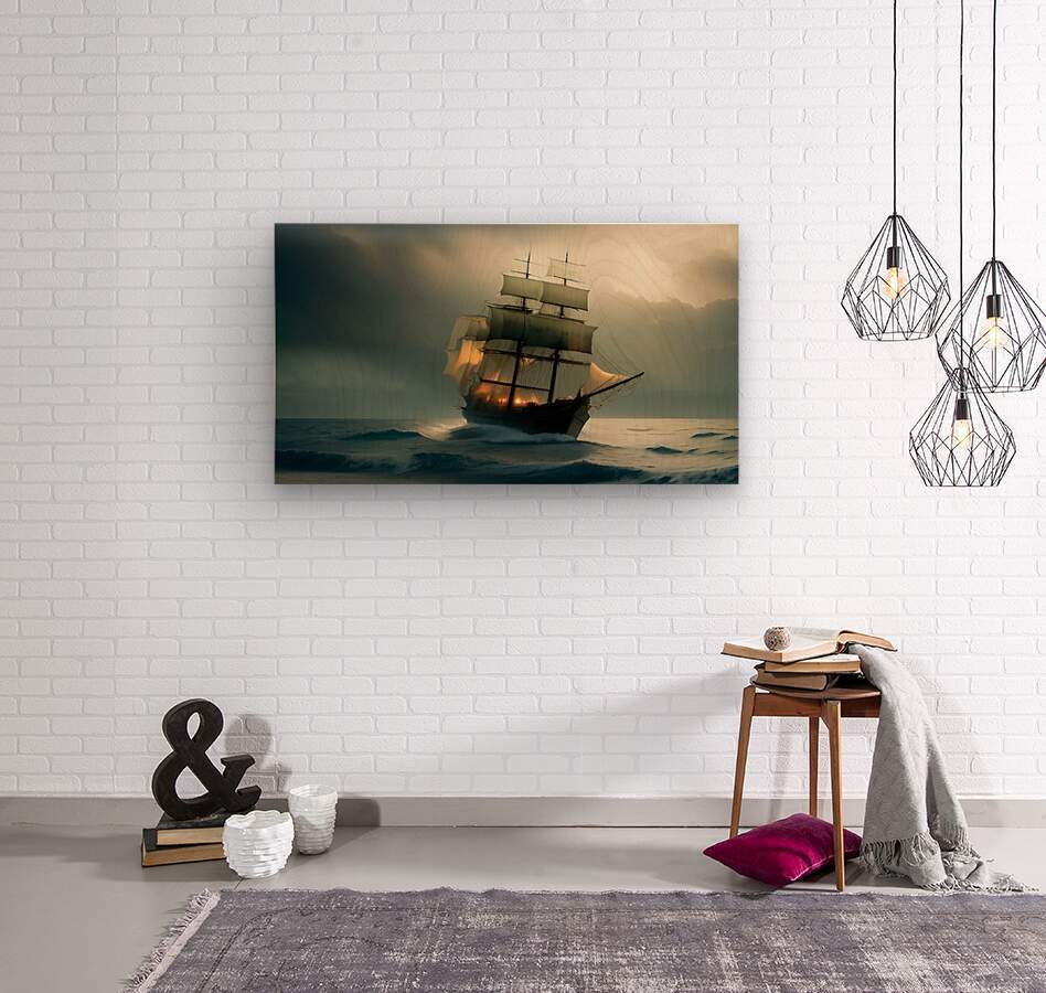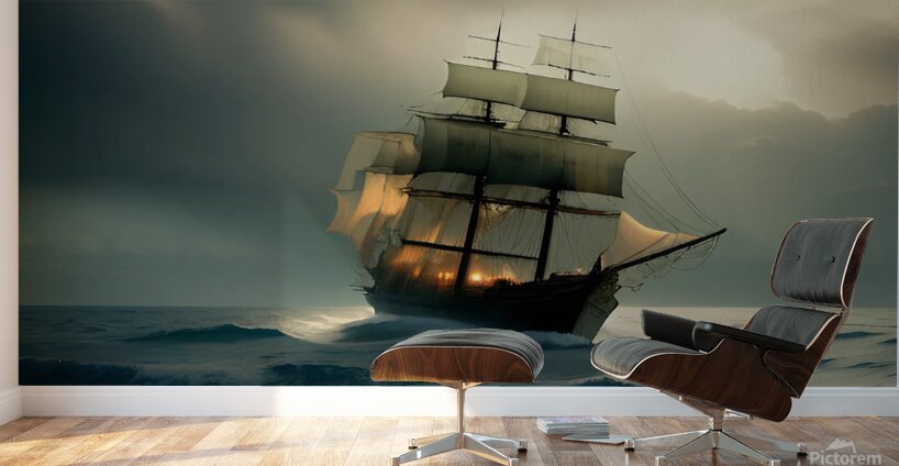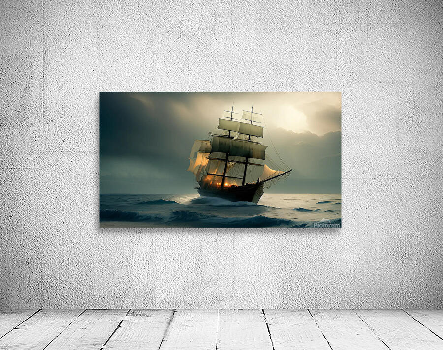 This dramatic image depicts a tall ship, its sails billowing, navigating through a churning sea under a brooding sky. The vessel is dramatically lit from within, casting a warm glow against the dark, stormy backdrop. This contrast between light and darkness creates a captivating and somewhat mysterious atmosphere, suggesting a story of resilience and adventure in the face of adversity. This image is ideal for adding a touch of nautical drama and intrigue to any space.