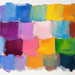 Grid of vibrant color swatches, exploring texture and interaction. Technique: Oil on canvas, influenced by Josef Albers and Ellsworth Kelly Artist's Intent: To showcase the interplay of color and texture in a structured format, inviting contemplation on color perception. Contribution: Appeals to collectors interested in color theory, abstract art, and minimalist aesthetics. Suitable for both residential and corporate spaces. Influences: Thick impasto strokes create textured color fields, reminiscent of Color Field painting but with a grid-like structure.