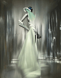 A striking fusion of high fashion and futuristic aesthetics, this artwork presents an enigmatic figure draped in a flowing, sculptural gown. With a sl...[+]
