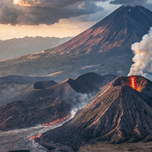 This image captures a stunning volcanic eruption, with molten lava flowing down the slopes of the mountain. Thick clouds of smoke and ash rise into th...[+]