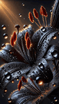 A breathtaking close-up of a black lily adorned with glistening dewdrops, illuminated by golden light. The deep black petals contrast beautifully with...[+]