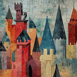 A cityscape of stylized castles evokes a dreamlike, timeless quality. Technique: Digital collage, influenced by Paul Klee and Lyonel Feininger. Arti...[+]
