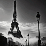 A timeless black-and-white depiction of the Eiffel Tower emerging from a sea of mist. The soft fog adds a mysterious and romantic atmosphere, enhancin...[+]