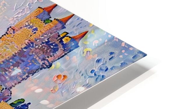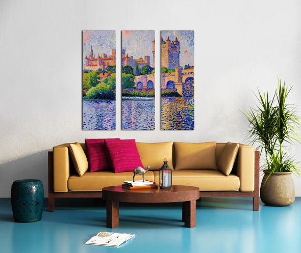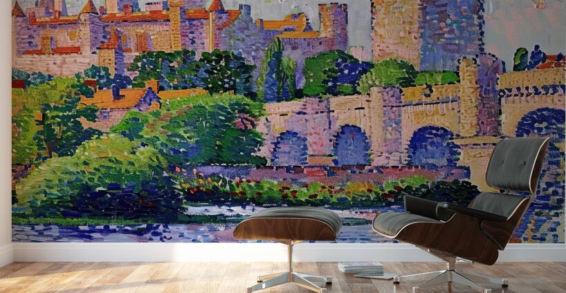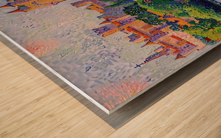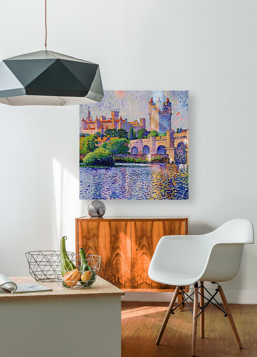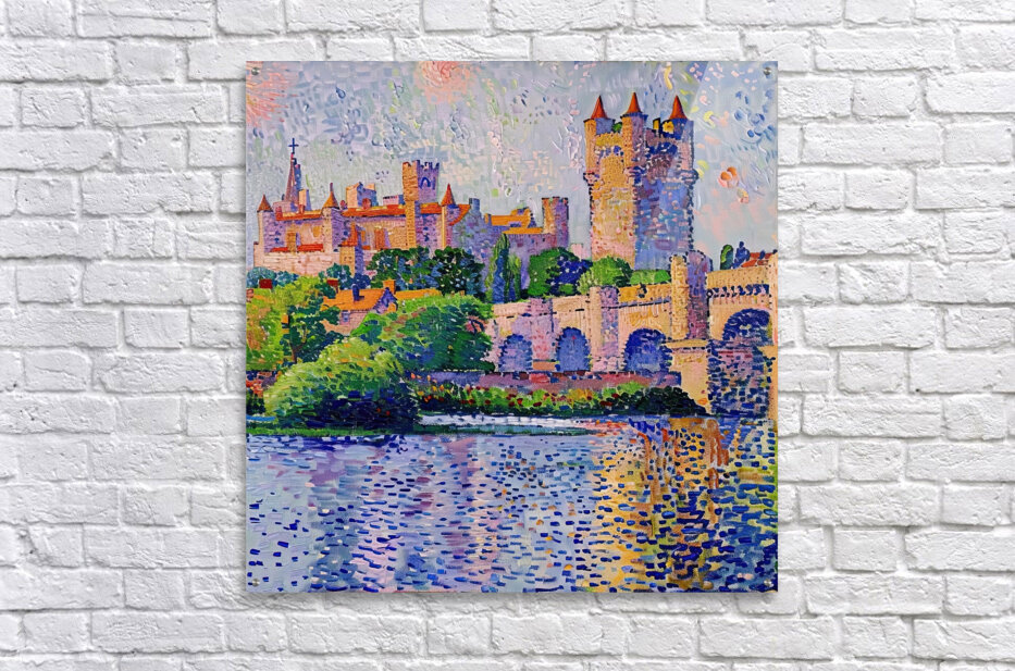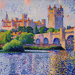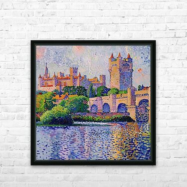 Pointillist painting of a medieval castle reflected in a river. Technique: Oil on canvas, influenced by Paul Signac and Claude Monet Artist's In...[+]