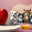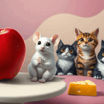 A white mouse eating a medium red apple. 5 cats look at it in amazement