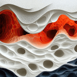 Layered paper sculpture creates a cavernous landscape with contrasting colors. Technique: Paper sculpture, influenced by Alexander Calder and Tara Donovan Artist's Intent: To evoke a sense of depth, mystery, and organic growth through layered paper forms. Contribution: Appeals to collectors interested in innovative sculpture, paper art, and abstract forms. Strong potential for gallery exhibitions and art fairs. Influences: Layered paper cutouts create a three-dimensional, textured effect, mimicking organic forms.