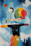 Abstract composition with balanced geometric and biomorphic forms against a vibrant blue backdrop. Technique: Acrylic on canvas, influenced by Wassily Kandinsky and Paul Klee. Artist's Intent: To evoke a sense of playful wonder and explore the interplay of cosmic elements. Contribution: Appeals to collectors of modern and abstract art, particularly those interested in playful, whimsical styles. Influences: Geometric abstraction with bold colors and playful forms. Brushstrokes are visible, adding a textured element.