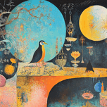 Whimsical bird perched on a platform beneath celestial orbs, surrounded by fantastical flora and objects. Technique: Acrylic on canvas, influenced by Remedios Varo and Marc Chagall Artist's Intent: To evoke a sense of wonder and mystery, inviting viewers into a dreamlike world of symbolic imagery. Contribution: Appeals to collectors of surreal and symbolic art, with potential for high-end décor markets. Influences: Detailed, dreamlike imagery with vibrant colors and intricate patterns, blending surreal and fantastical elements.