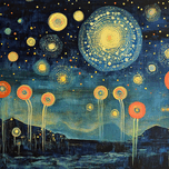 Whimsical celestial orbs rise from a dreamlike landscape. Technique: Acrylic on canvas, influenced by Yayoi Kusama and Remedios Varo. Artist's Intent: To evoke a sense of wonder and magic, blurring the lines between the celestial and terrestrial. Contribution: Appeals to a broad audience with its vibrant colors and whimsical nature. Influences: Layered impasto and intricate detailing create a textured dreamscape.