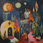 Whimsical cityscape under a vibrant moonlit sky, with playful architectural and organic forms. Technique: Acrylic on canvas, influenced by Paul Klee ...[+]