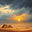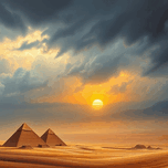 This oil painting depicts a dramatic desert scene with pyramids under a golden sunset. The sky is filled with dark storm clouds, creating a stunning c...[+]