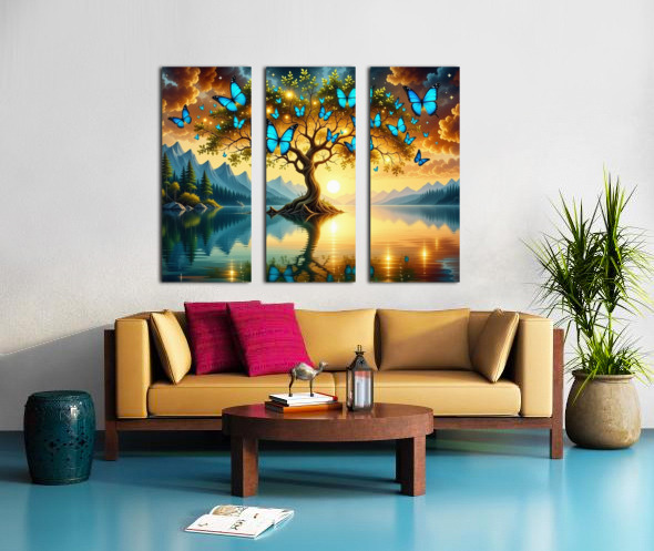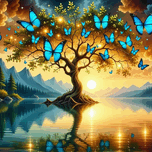 A surreal, high-quality fantasy mural that combines enchanting nature and mythical worlds. In the center, **a giant tree with luminous golden trunks** whose branches intertwine like arteries, whose leaves turn into **turquoise and aquamarine butterflies** that fly through the air. Beneath it, an emerald lake** reflects a crimson-red sky with sunset clouds, and white lotus flowers float on its surface. On the right, **a transparent crystal spiral staircase** leads to a light gate flanked by **dragons with colorful peacock feathers** and phoenixes with wings of **glowing blue flame**. On the left, **silken waterfalls** flow between rocks covered in radiant moss, while in the background are **small mountain villages** with hanging houses decorated with golden paper lamps. Details include **ancient carvings** and **Islamic and geometric motifs** fused with traditional Asian graphics. Dramatic lighting shows **sunlight breaking through the clouds**, with **hidden rainbows** and phosphorescent stars at the top.