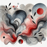 A captivating abstract painting featuring fluid, organic shapes in shades of black, gray, and red. The watercolor-style composition creates a sense of...[+]