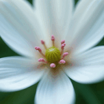 A stunning macro shot capturing the intricate details of a white flower with soft pink stamens and a vibrant green center. The shallow depth of field ...[+]