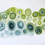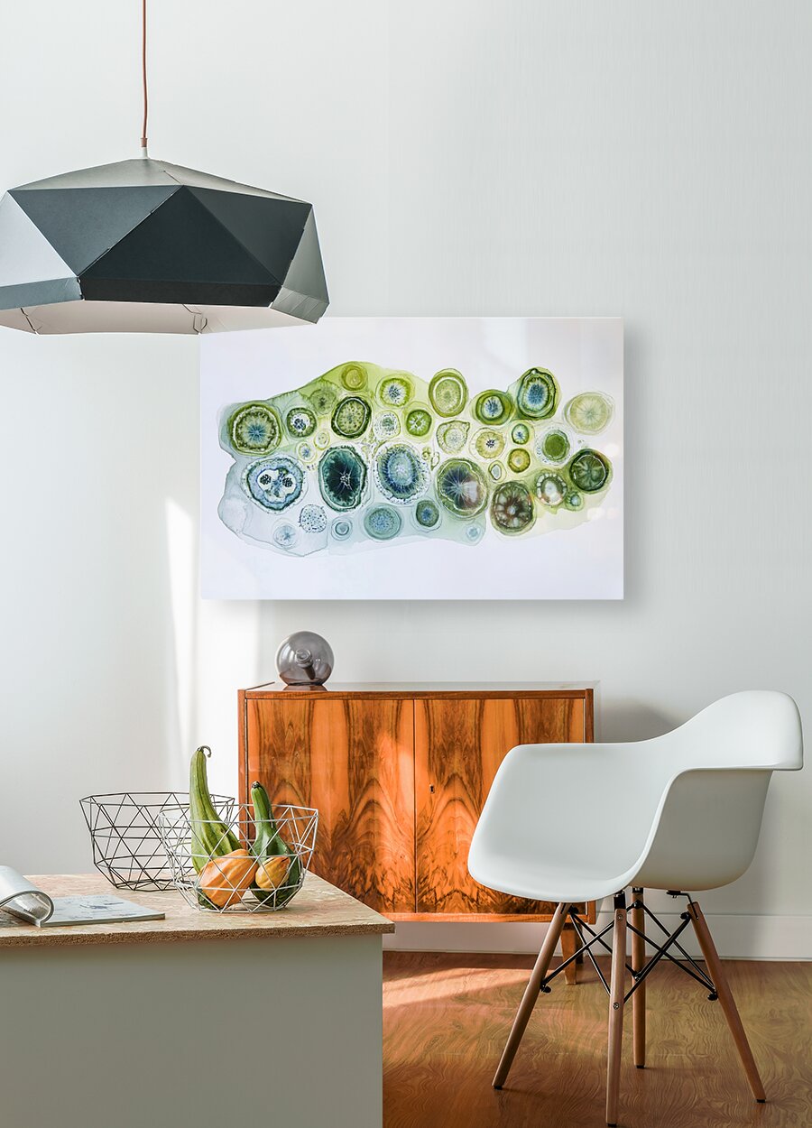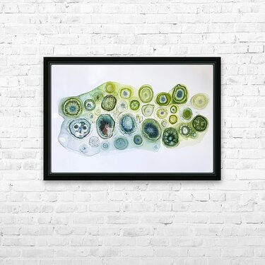 Abstract depiction of cellular structures, blending scientific accuracy with artistic expression. Technique: Watercolor on paper, influenced by Georgia O'Keeffe and Ernst Haeckel Artist's Intent: To evoke a sense of wonder and appreciation for the hidden beauty of the natural world at a microscopic level. Contribution: Appeals to collectors interested in bio-art, abstract organic forms, and contemporary watercolor. Influences: Detailed organic forms using watercolor washes and fine line details. Subtle color gradients create depth and luminosity.