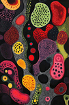 Vibrant, abstract composition of organic forms covered in dots. Technique: Acrylic on canvas, influenced by Yayoi Kusama and Jackson Pollock Artist's Intent: To evoke a sense of microscopic life and cellular energy through vibrant colors and intricate patterns. Contribution: Appeals to collectors of contemporary abstract art and those drawn to vibrant, biomorphic aesthetics. Influences: Organic shapes layered with intricate dot patterns and web-like overlays create a dynamic composition.