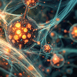 Microscopic view of vibrant, glowing cellular structures interconnected by a network of delicate filaments. Technique: Digital rendering, influenced ...[+]